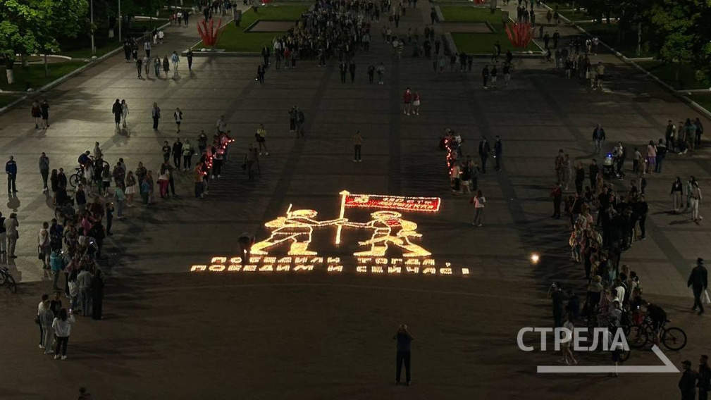 Участники памятной акции поставили лампадки по контуру, формируя изображение Знамени Победы. В итоге был создан масштабный образ двух воинов со Знаменем Победы и надписью «Победили тогда, победим и сейчас!».