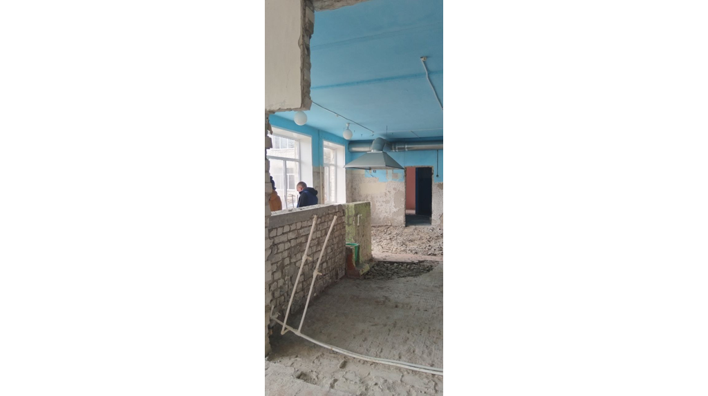 В настоящее время строители выполняют демонтажные работы в пищеблоке. На втором этаже идет подготовка к прокладке труб канализационной системы, монтаж электроснабжения и полов.