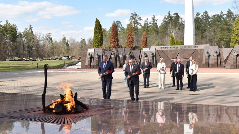 Гости из Белоруссии и глава региона посетили мемориальный комплекс «Партизанская поляна», где возложили цветы.