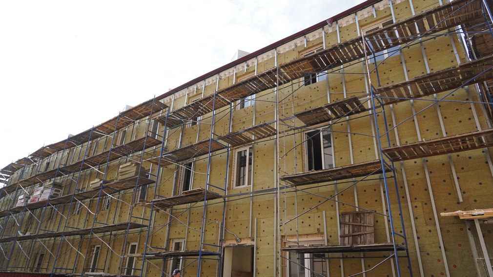 В здании общежития строители уже вышли на чистовую отделку второго и третьего этажа. Специалисты утеплили фасад и сделали водосточную систему кровли.
