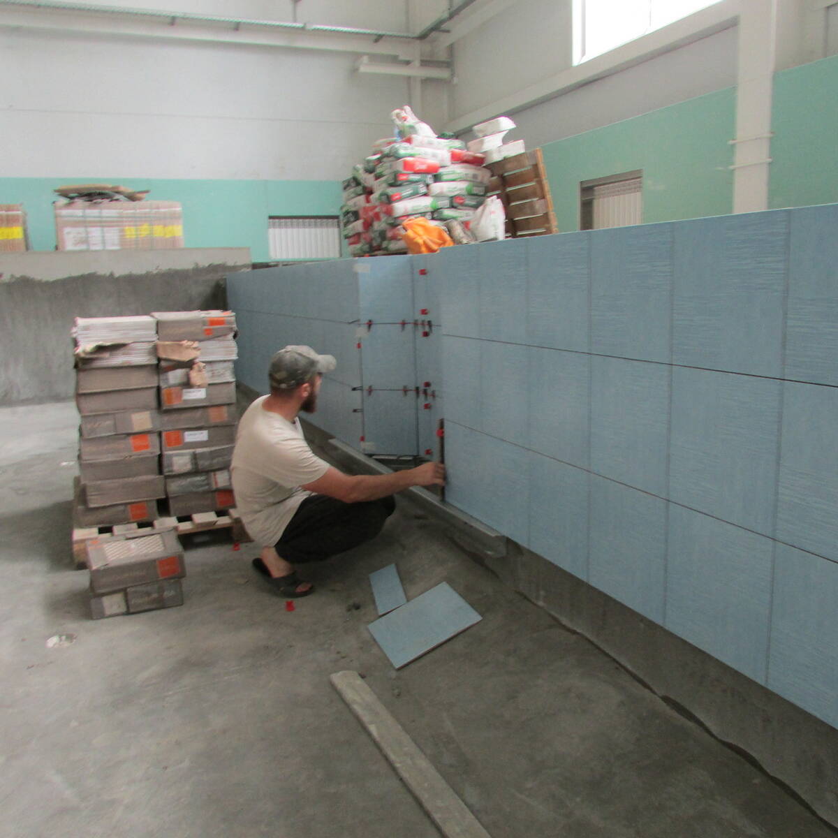 На следующей неделе в соответствии с проектом в некоторых помещениях будет уложен линолеум. В спортивном зале паркет обработают специальным лаком, который уже доставили. В бассейне укладывают кафельную плитку на стены и дно. Вдоль окон установлены перегородки, которые оштукатурят и покрасят влагостойкими красками. На радиаторы установят решетки. В раздевалках, душевых и санузлах сантехники завершают монтаж фаянсовой сантехники. Специалисты субподрядной организации занимаются благоустройством территории.