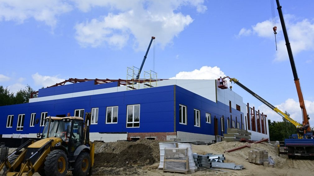 В комплексе будет современный центр с 25-метровым бассейном и универсальным спортивным залом. Уже установлены металлические колонны, оштукатурены перегородки в административной зоне и запущена котельная. Ведутся работы по монтажу кровельных ферм, стеновых панелей и чаши бассейна.