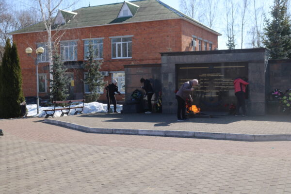Мужчины в это время занимались погрузкой собранного мусора на специализированную технику. Особое внимание было уделено благоустройству площади возле стелы, посвящённой семи героям.