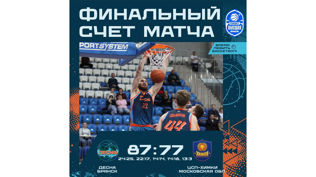 Брянская команда «Десна» в очередном туре чемпионата высшей лиги по баскетболу на своей площадке одержала две победы над клубом «ЦСП-Химки» из Московской области. Как сообщает «Брянская Губерния», первая четверть игры со счетом 24:25 завершилась в пользу гостей.